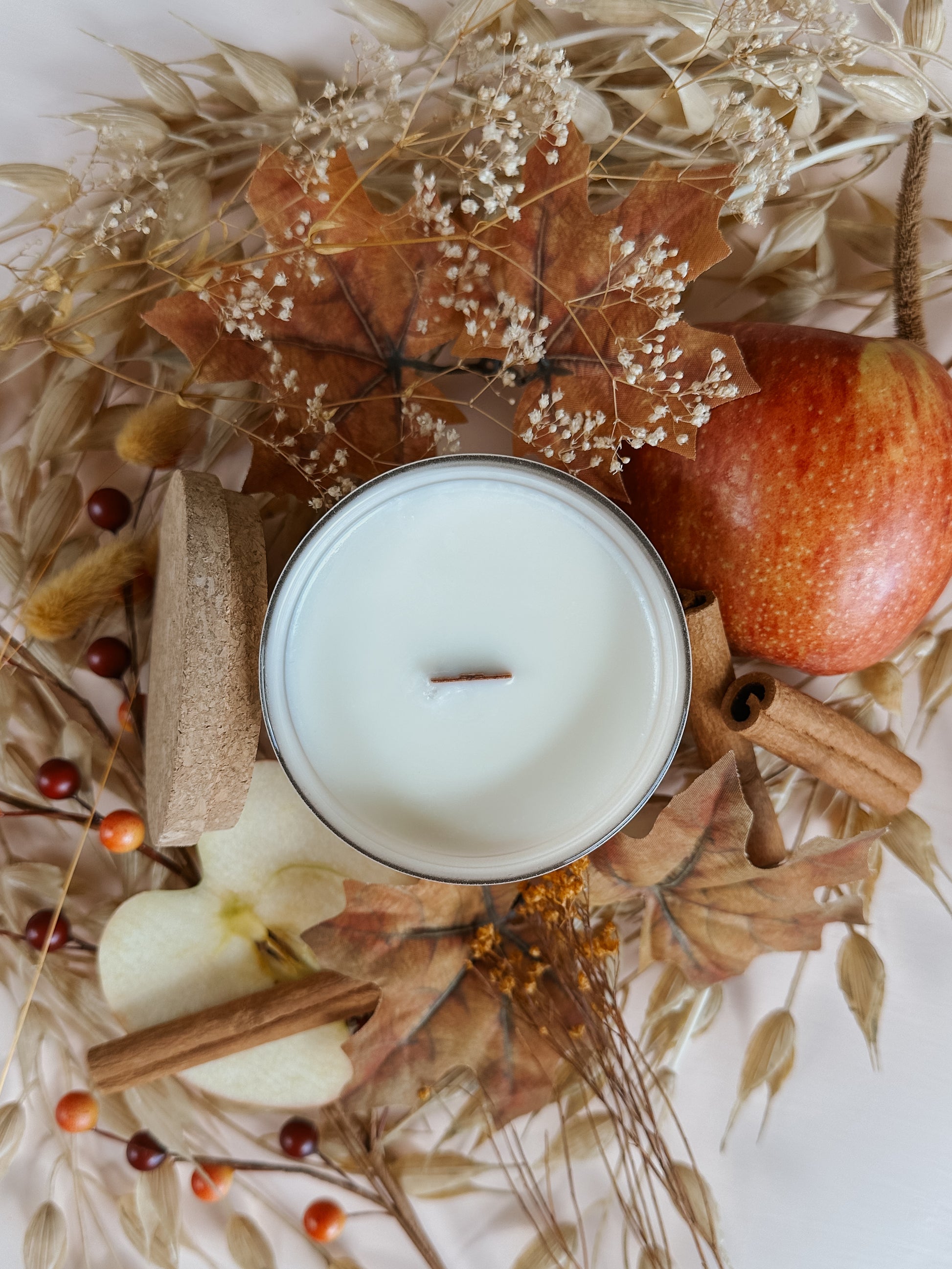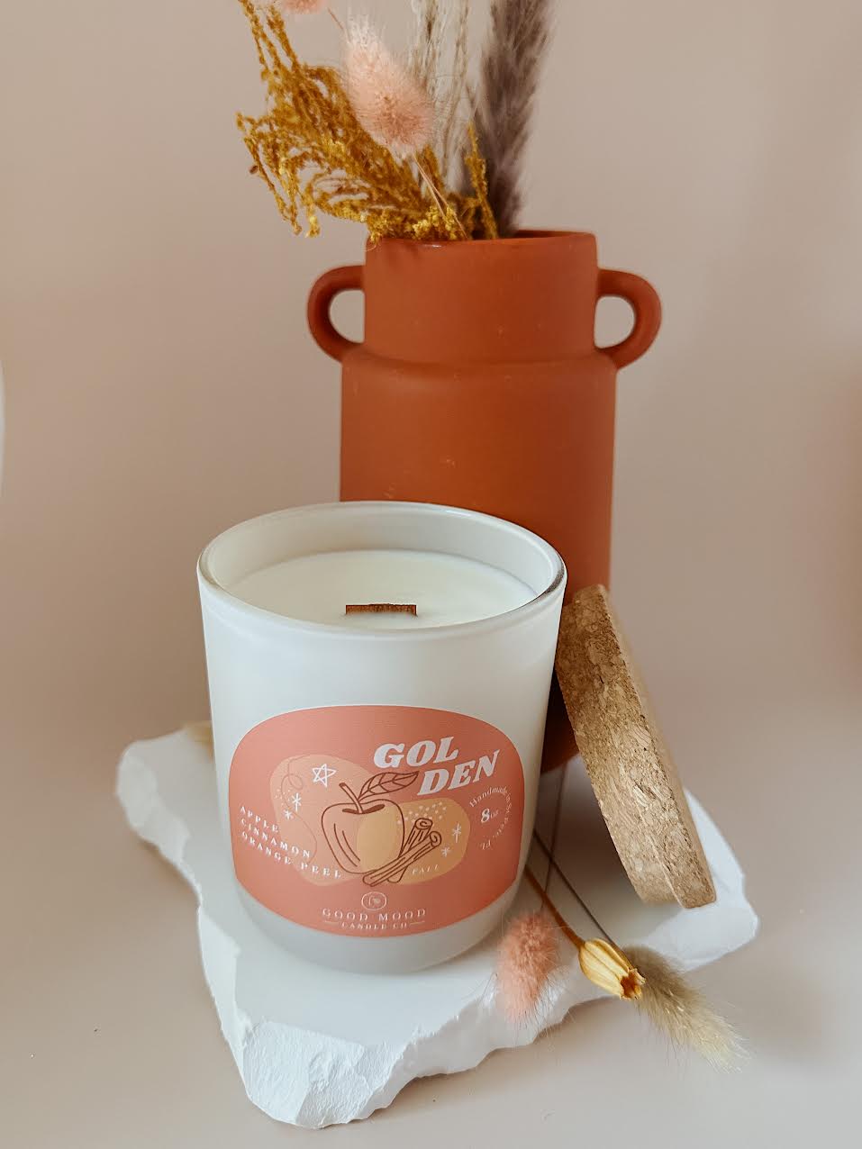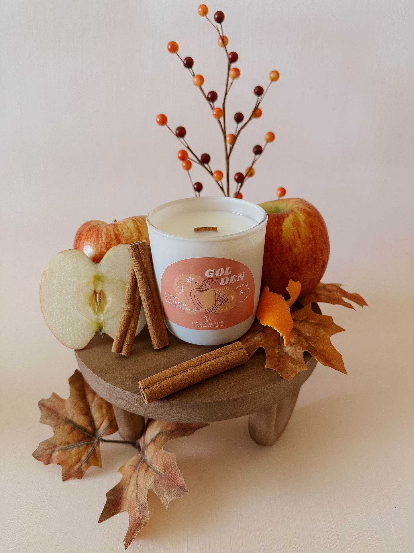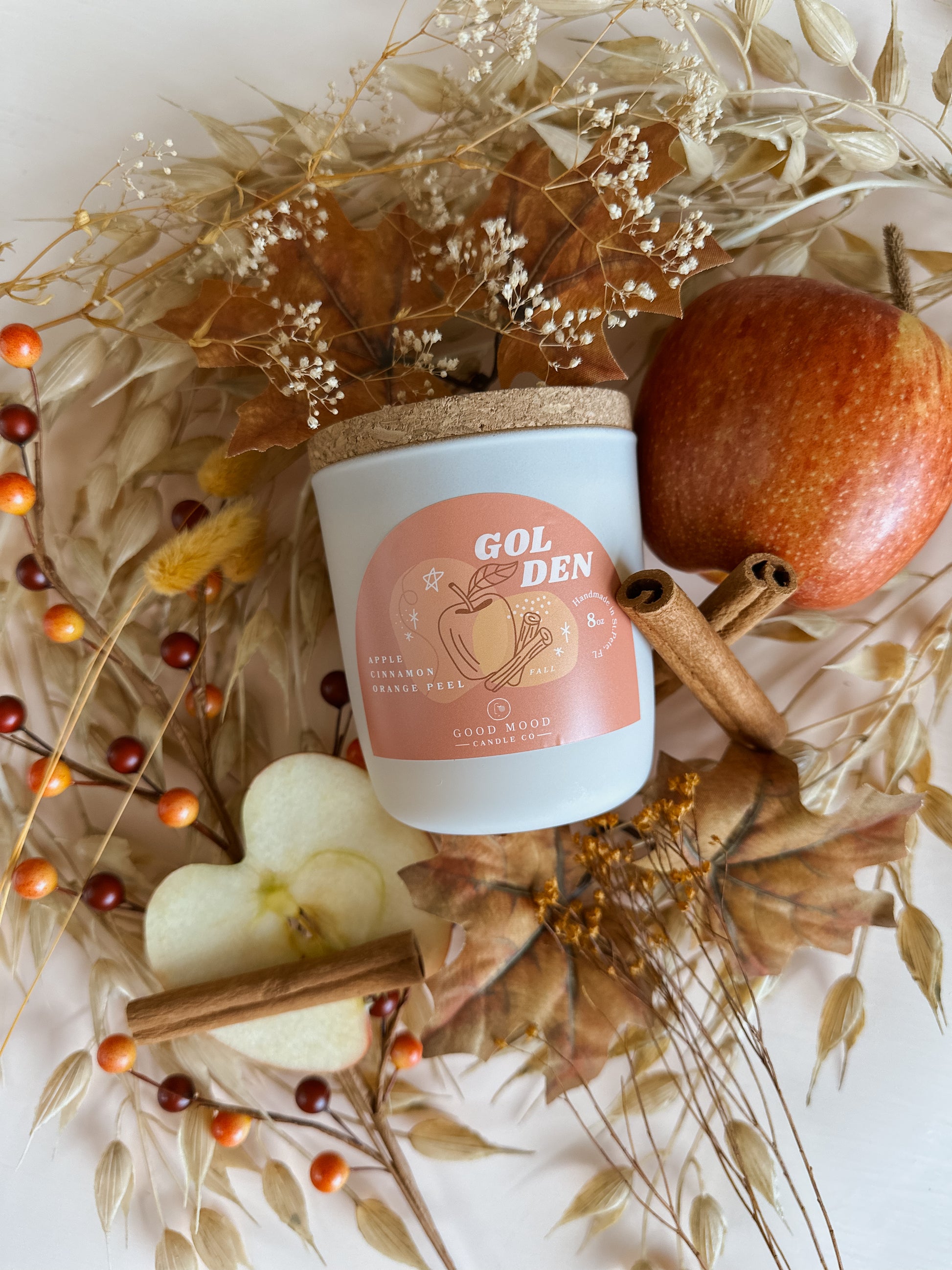 If fresh crisp apple mixed with cinnamon-y baked apples means Fall for you, Golden is your candle! We've custom blended this fall seasonal candle to help create a golden space of crisp, fresh apples, and warming spices. Golden will make you feel like an apple orchard is right out the window with hot apple pie baking in your oven. Blended with McIntosh apples, cinnamon, and a touch of orange peel, you'll want to burn this crackling candle over and over again!