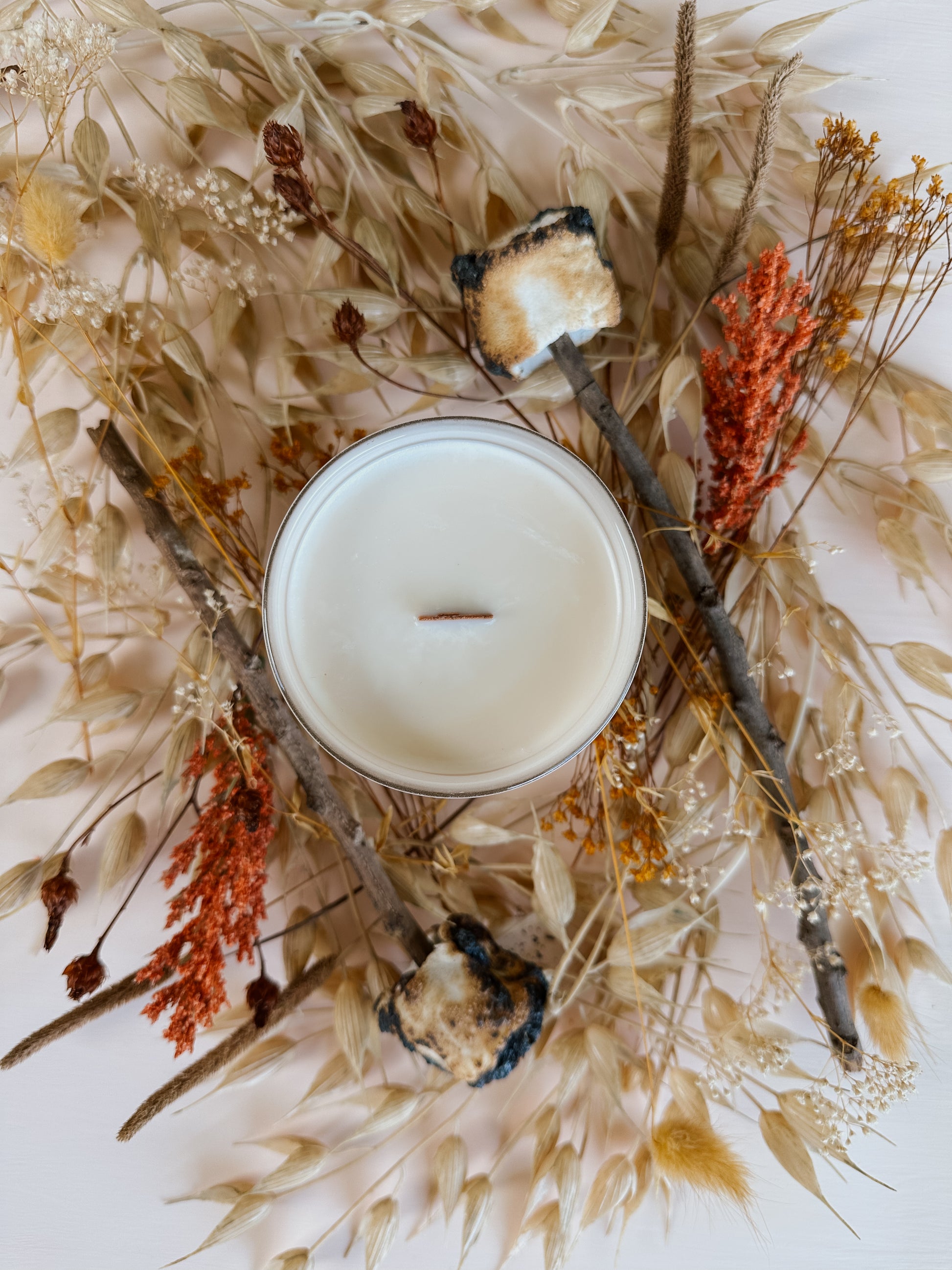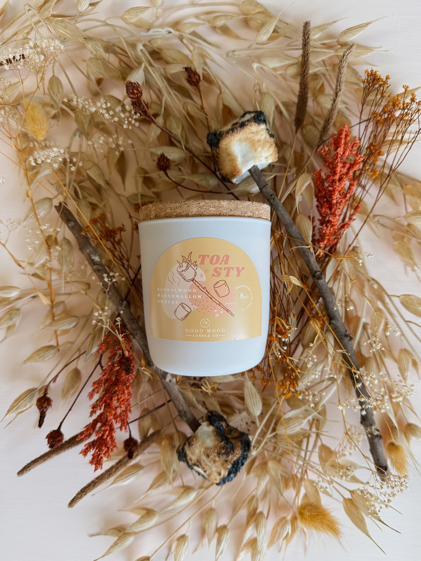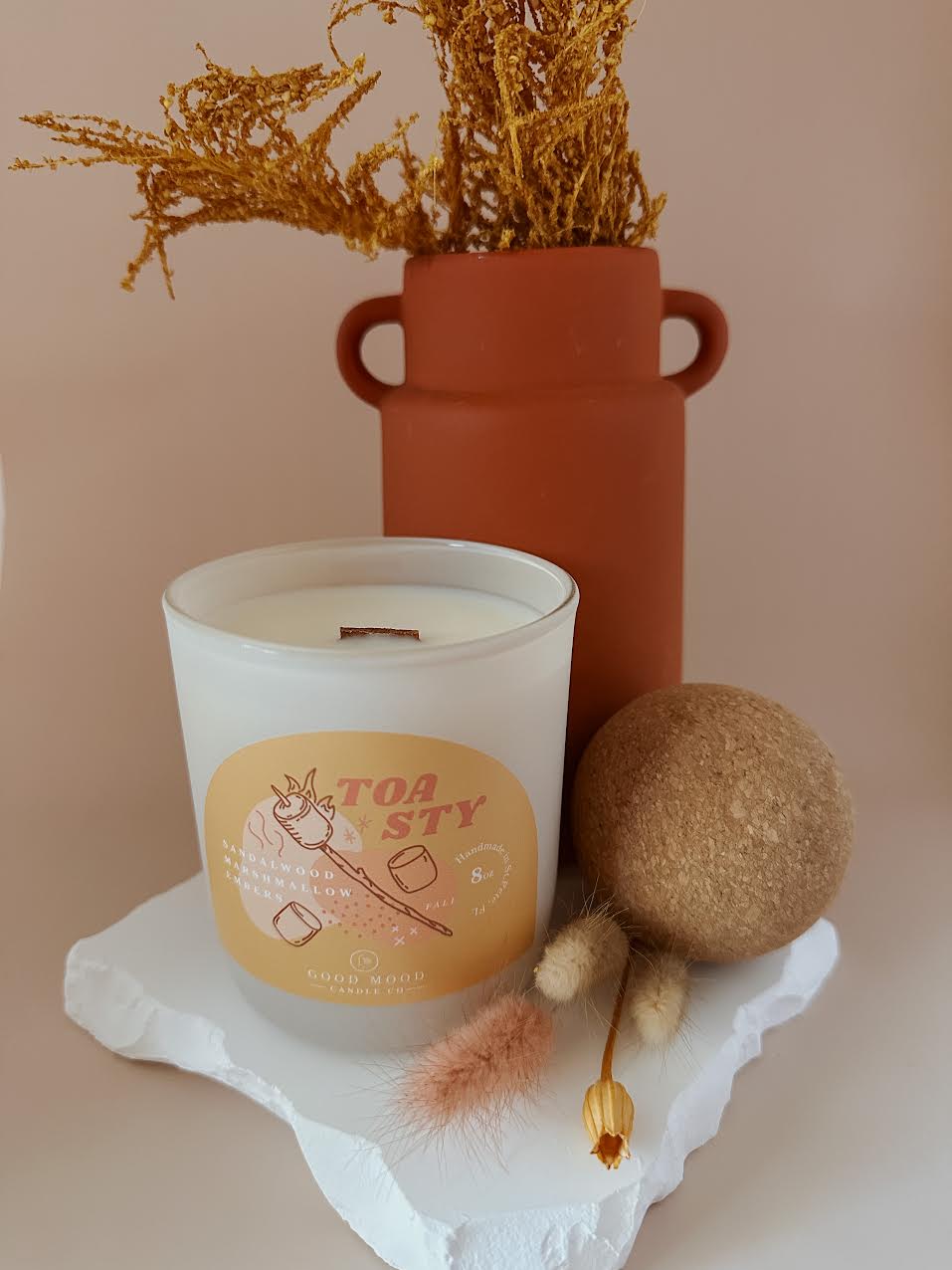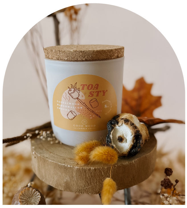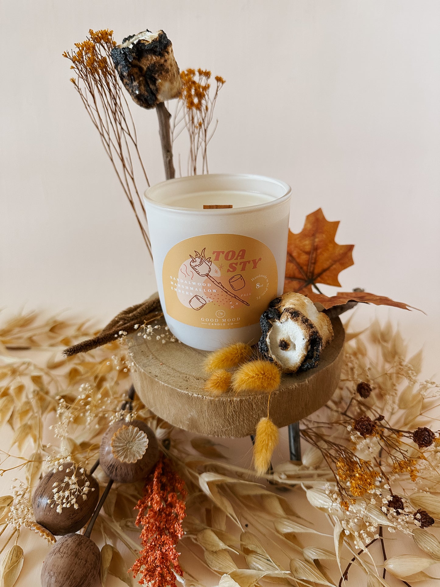 With that crisp cool weather, brings warm bonfires, and roasted marshmallow treats. We've custom blended this candle to make you feel warm and cozy wherever you are. Toasty will make you feel like you're gathered with friends on a cool evening huddled around a smoky fire, and snacking burnt marshmallows. Don't be fooled by the marshmallow, this candle is full of smoky goodness balanced with a sweet treat. Oh, and did we mention our wooden wick candles crackle?