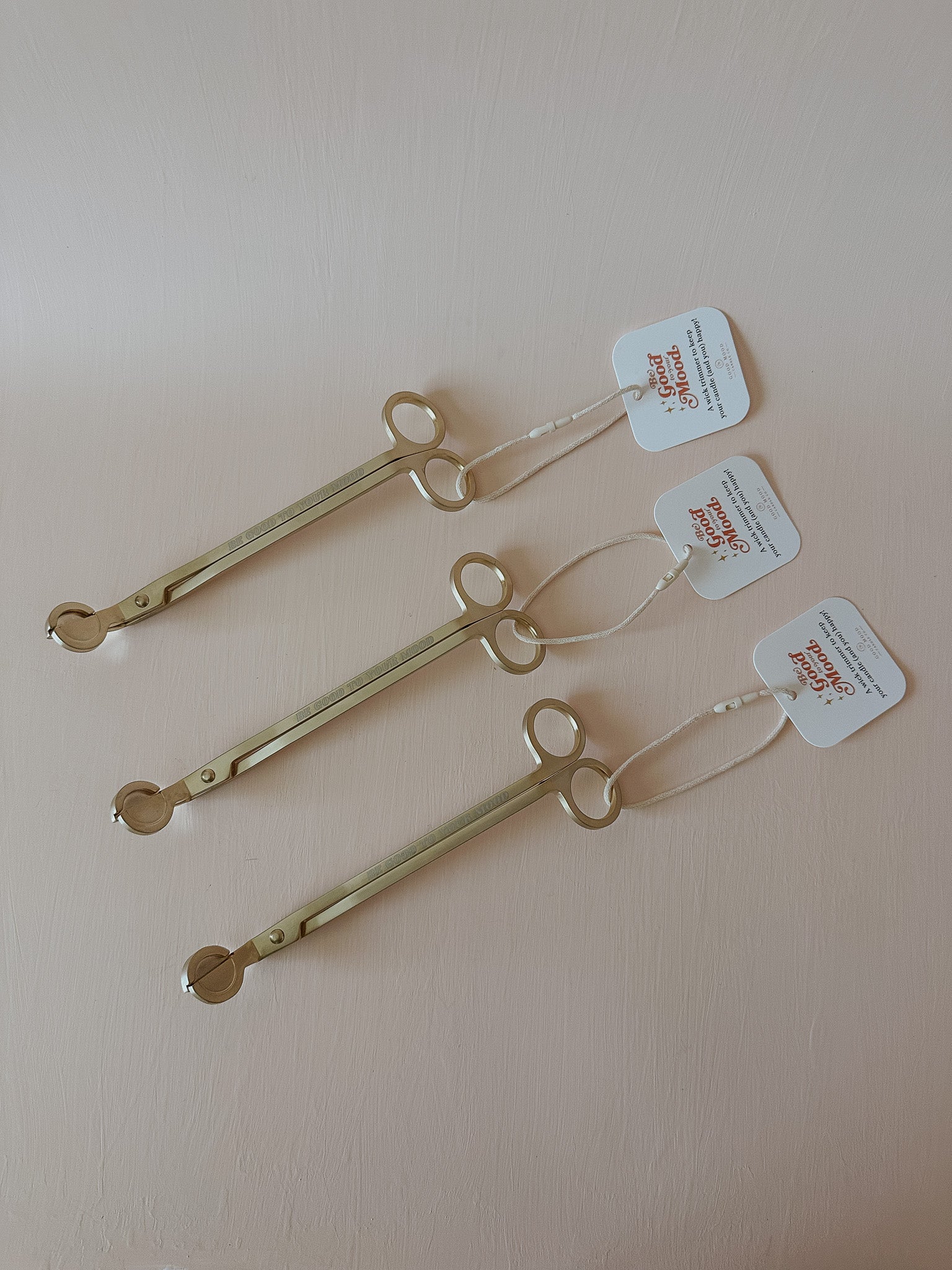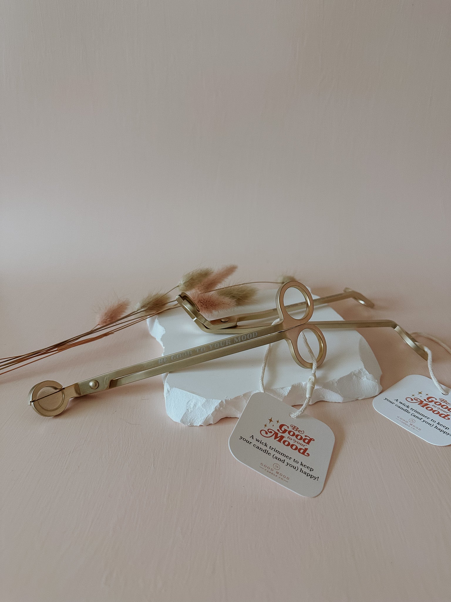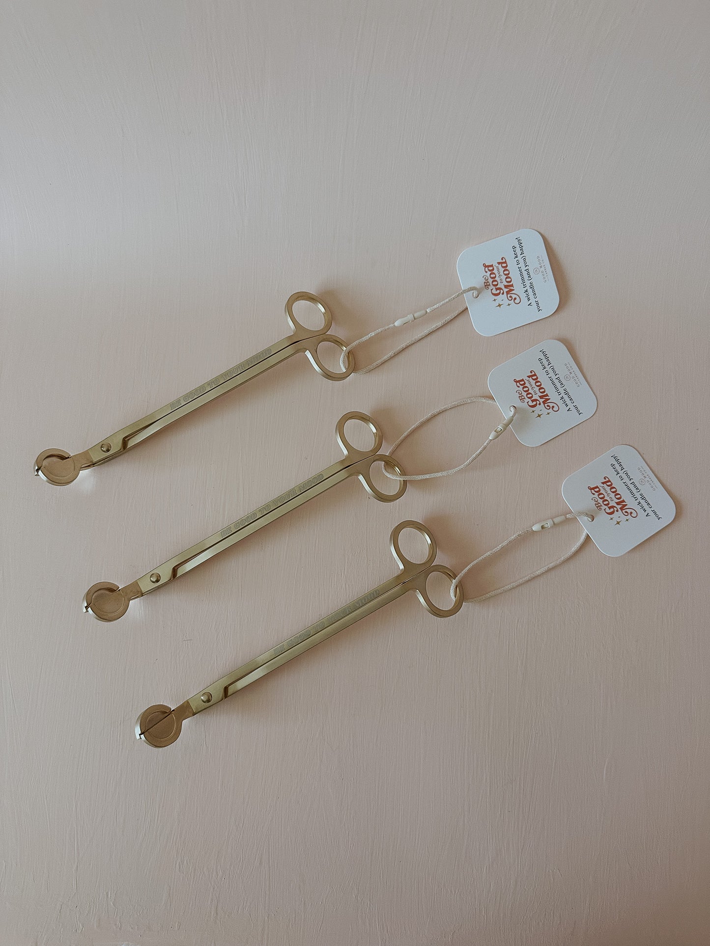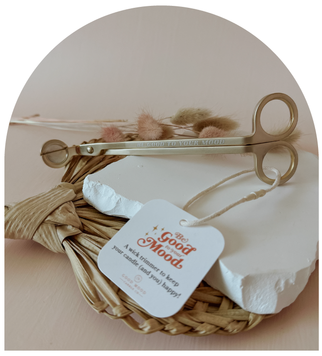 This brushed gold wick trimmer quickly, easily, and cleanly snips off the burnt bits of your wick for proper burning, AND, with the engraving of "Be good to your mood" it looks so good next to your candle set up (win win).